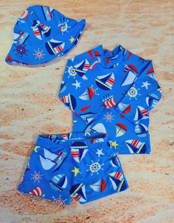 Conjunto Moda Praia com estampa de Barcos e proteção solar fator 50UV para menino