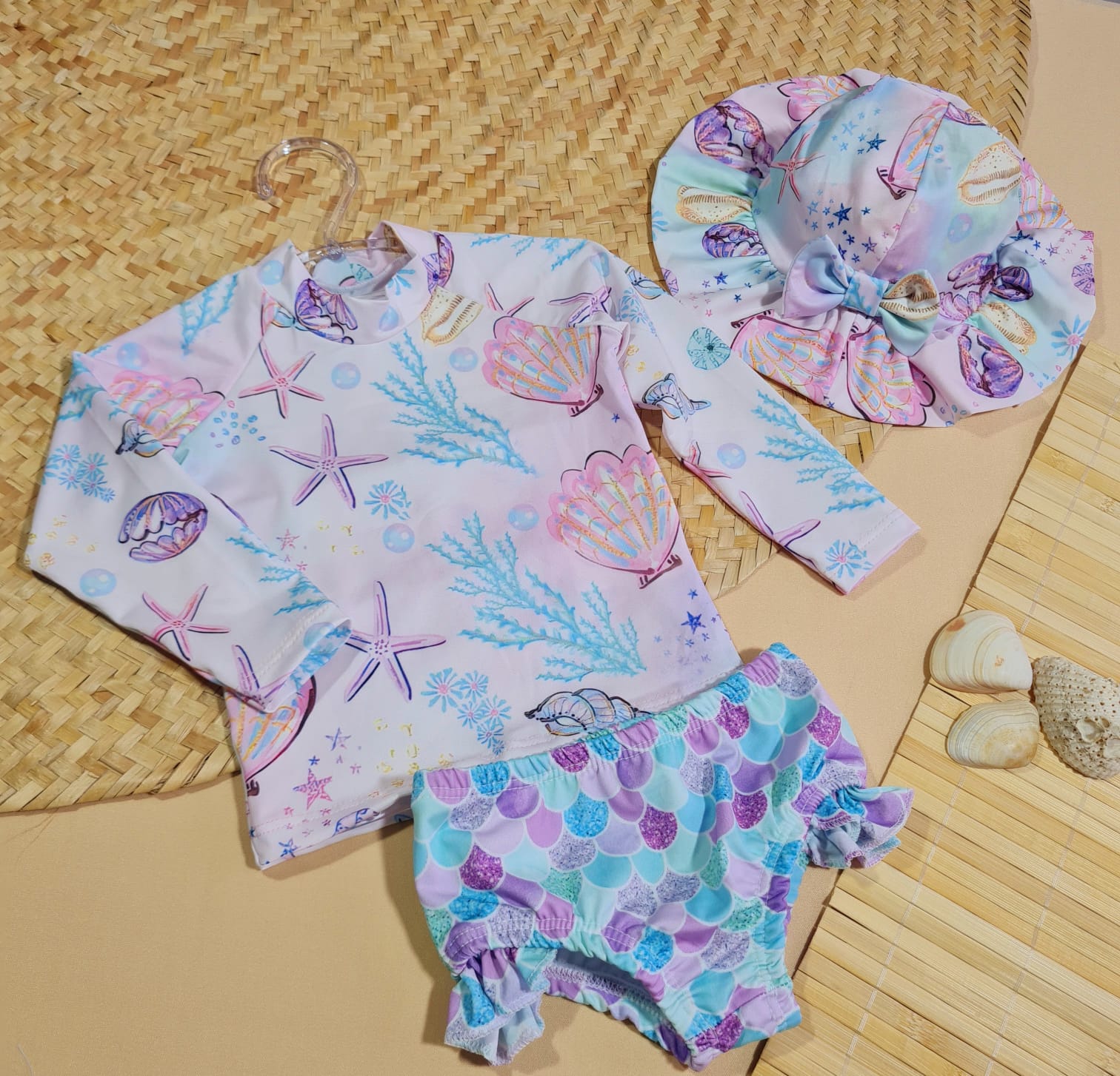 Conjunto completo com estampa de conchas e escamas para meninas com fator de proteção solar UV50