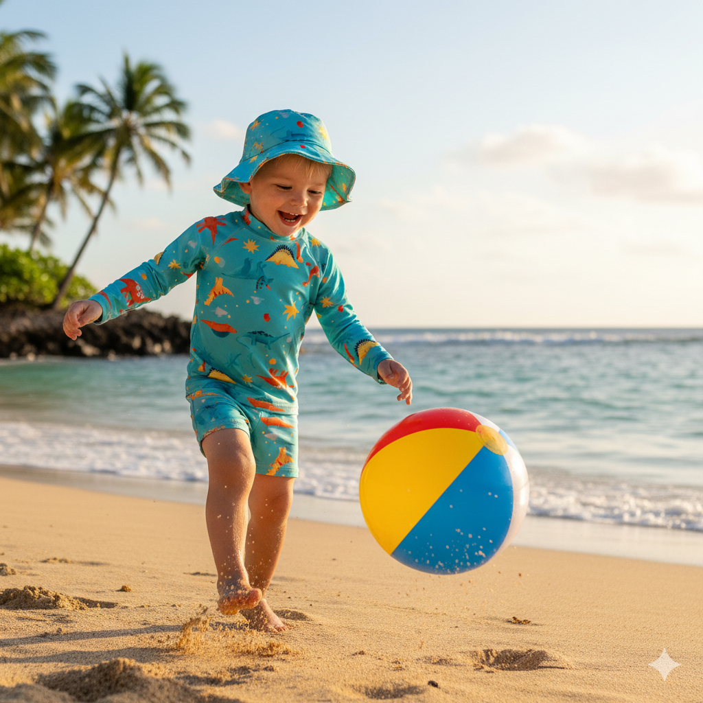 Assim não precisa passar protetor solar nos braços e costas, além de proteger a cabecinha do baby.