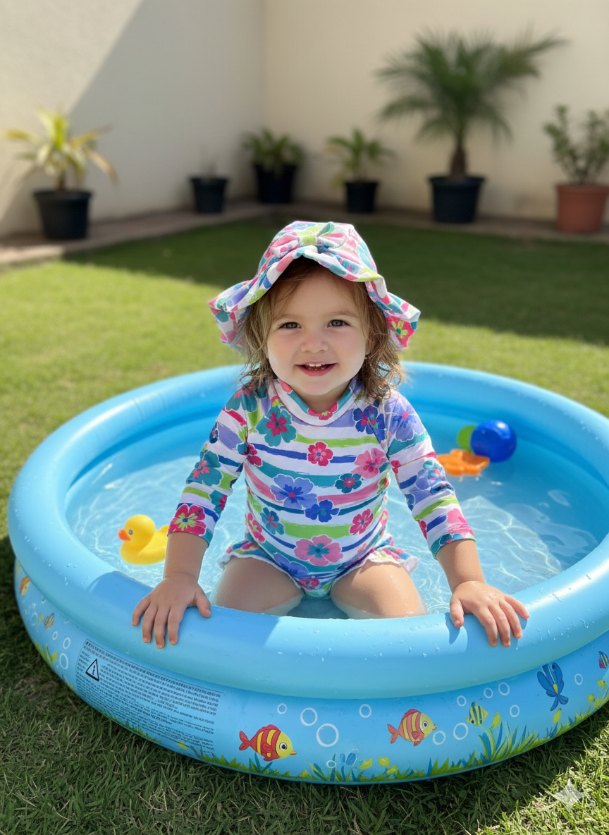 Assim não precisa passar protetor solar nos braços e costas, além de proteger a cabecinha do baby.