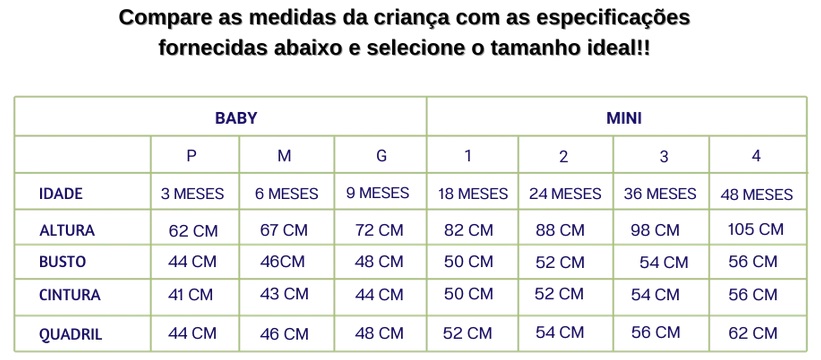 Peça com tamanhos do G até 4 anos. Escolha o tamanho para o seu baby.