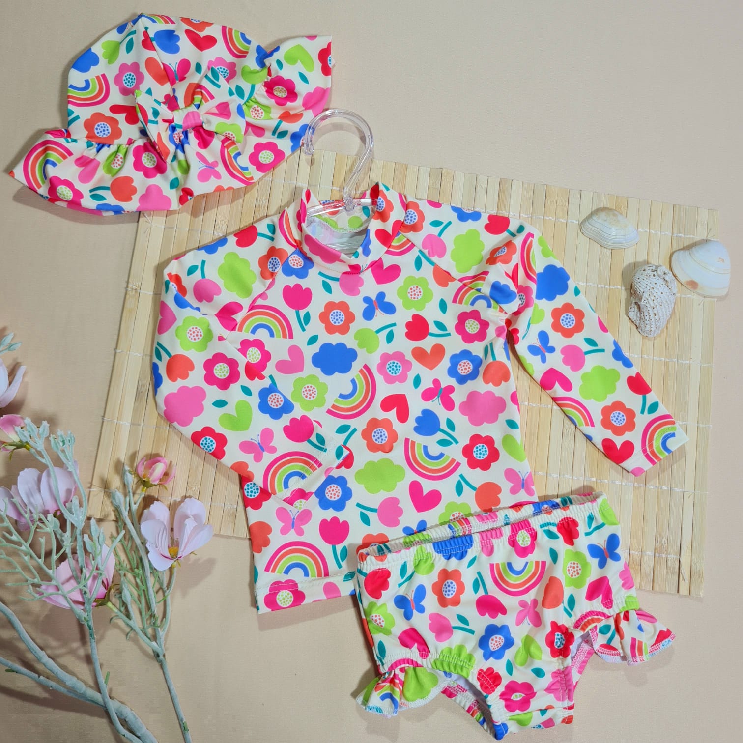 Conjunto completo com estampa de flores para meninas com fator de proteção solar UV50