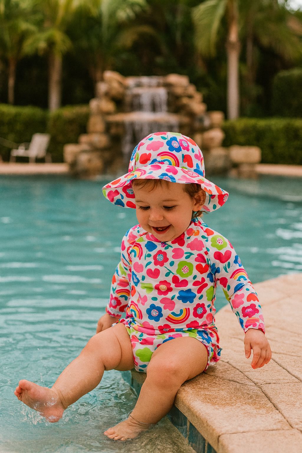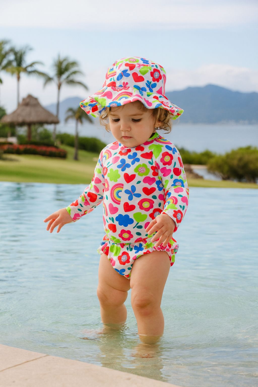 Assim não precisa passar protetor solar nos braços e costas, além de proteger a cabecinha do baby.