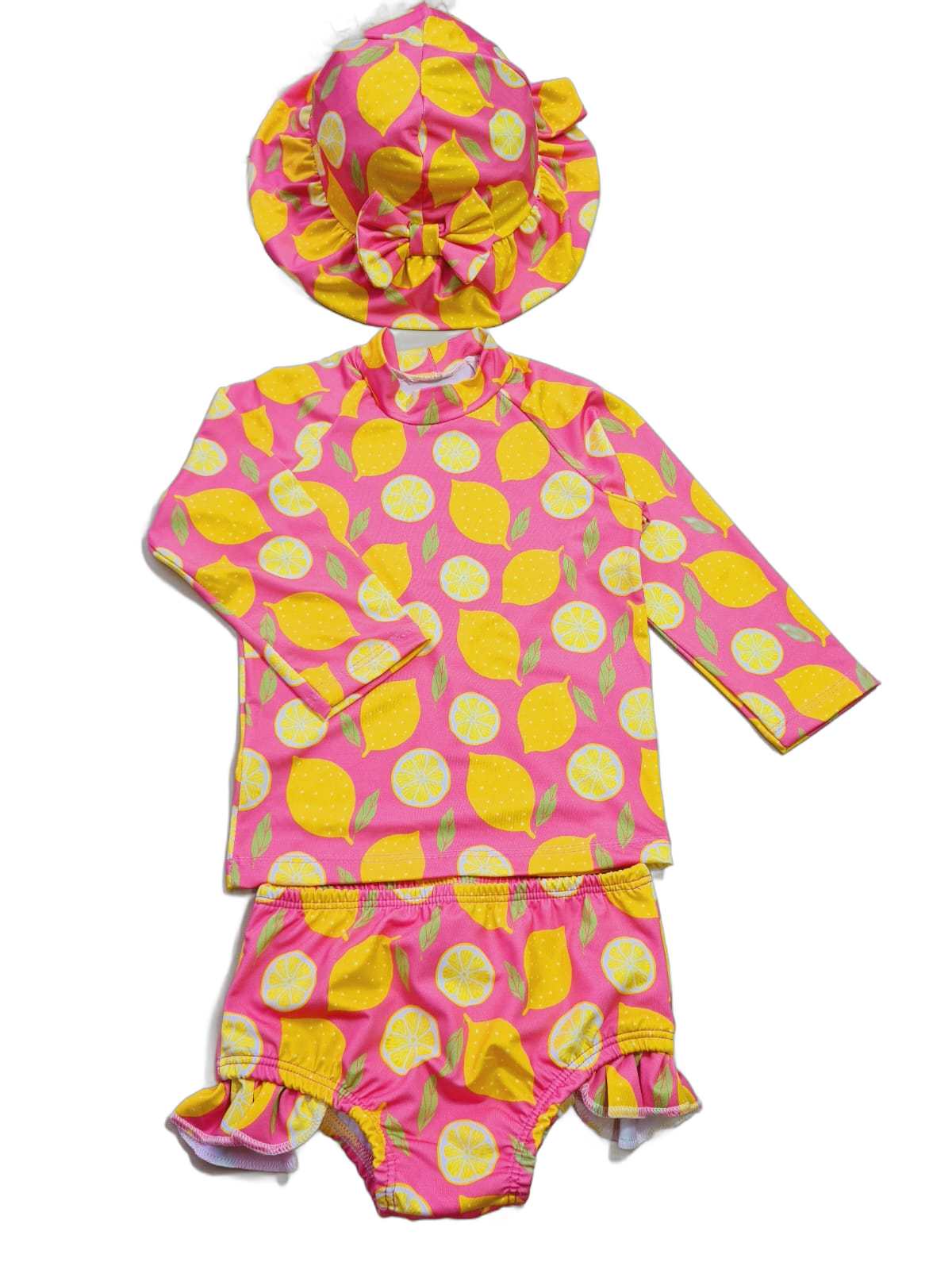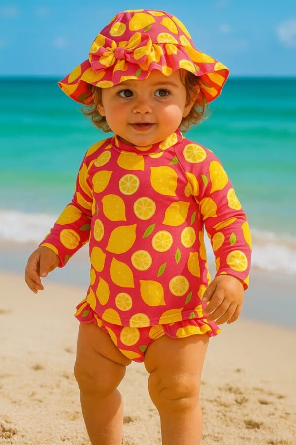 Conjunto completo de moda com estampa de limão para meninas com fator de proteção solar UV50