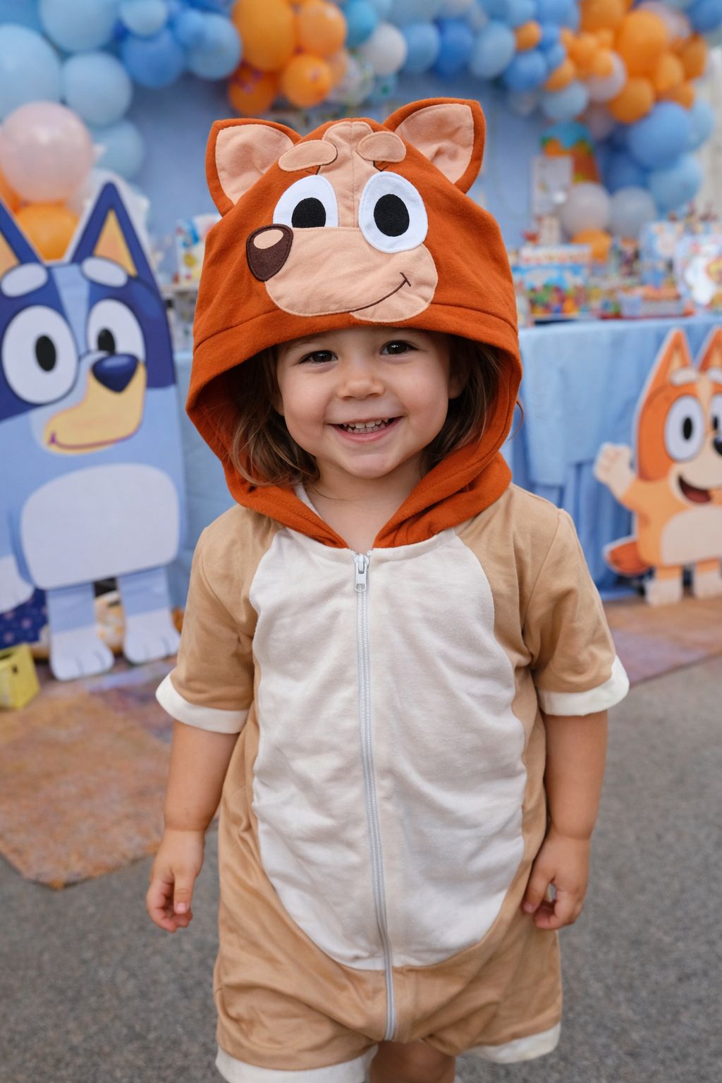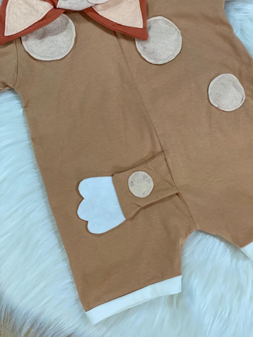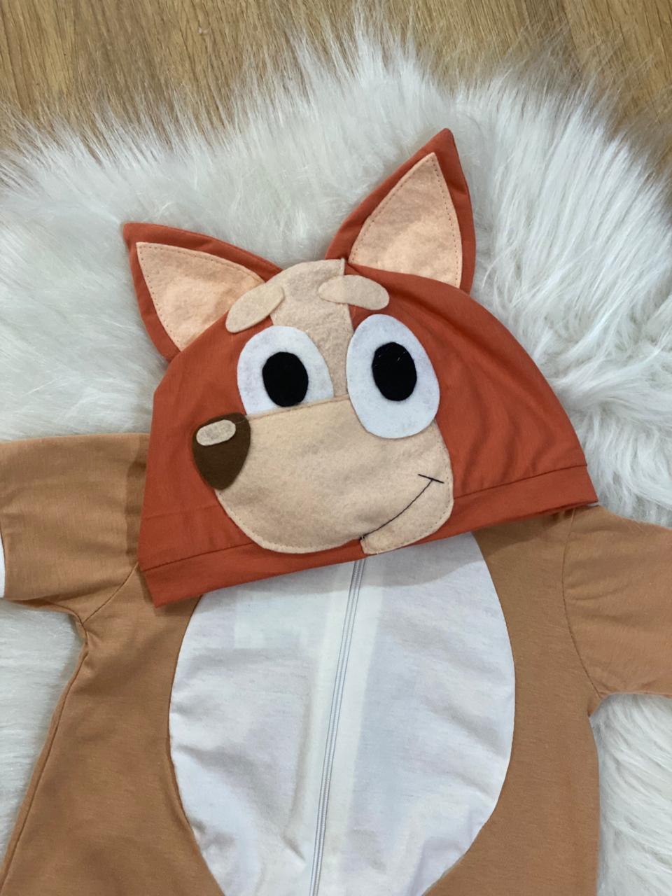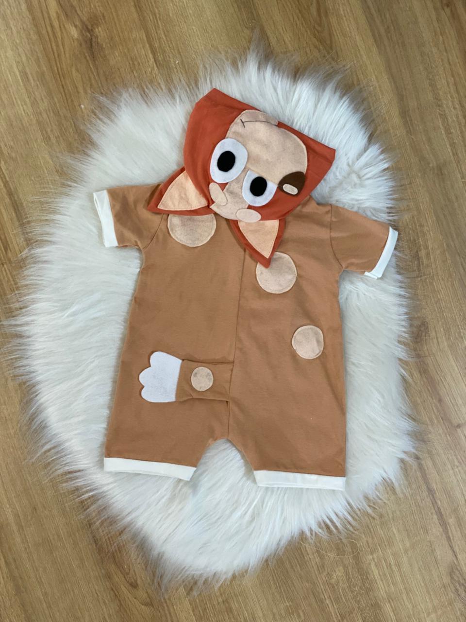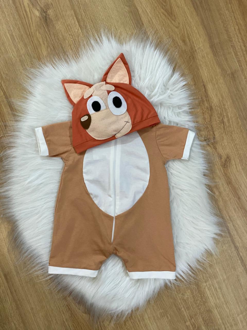 Macacão suuuper fofo simulando a fantasia do cachorrinho australiano Bingo do desenho Bluey.