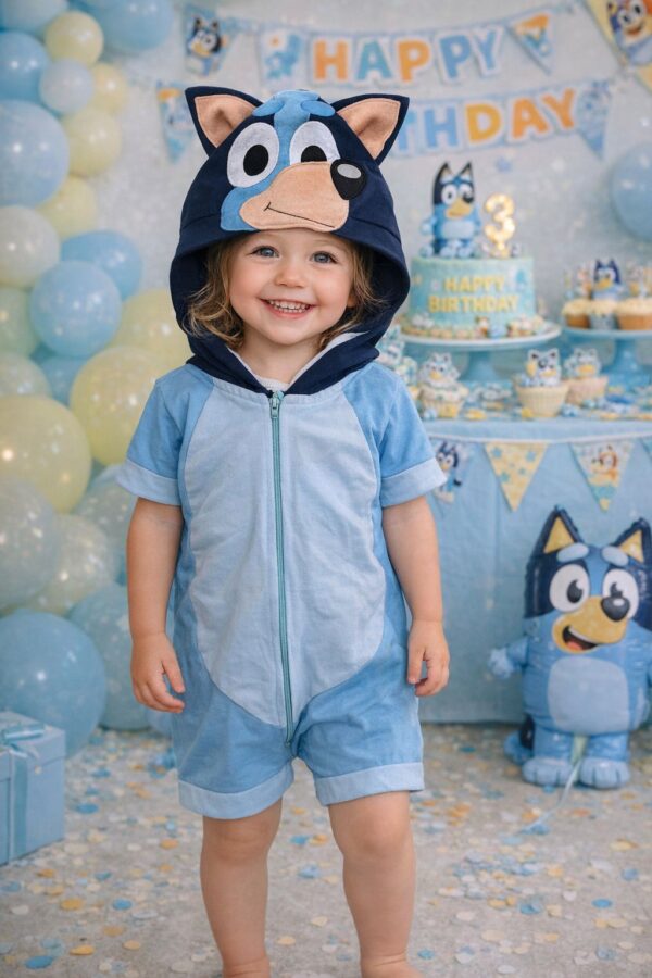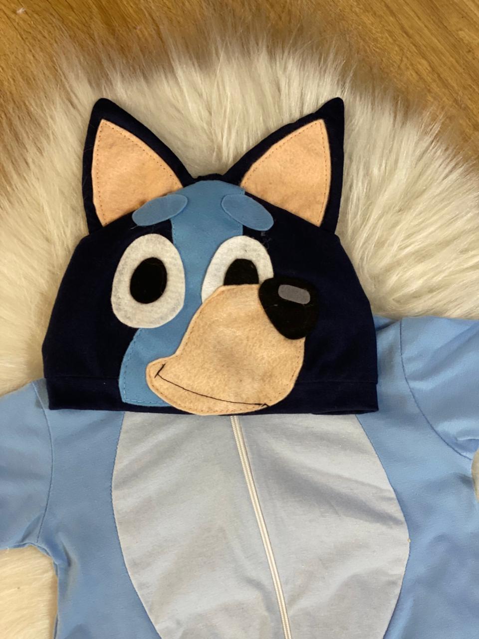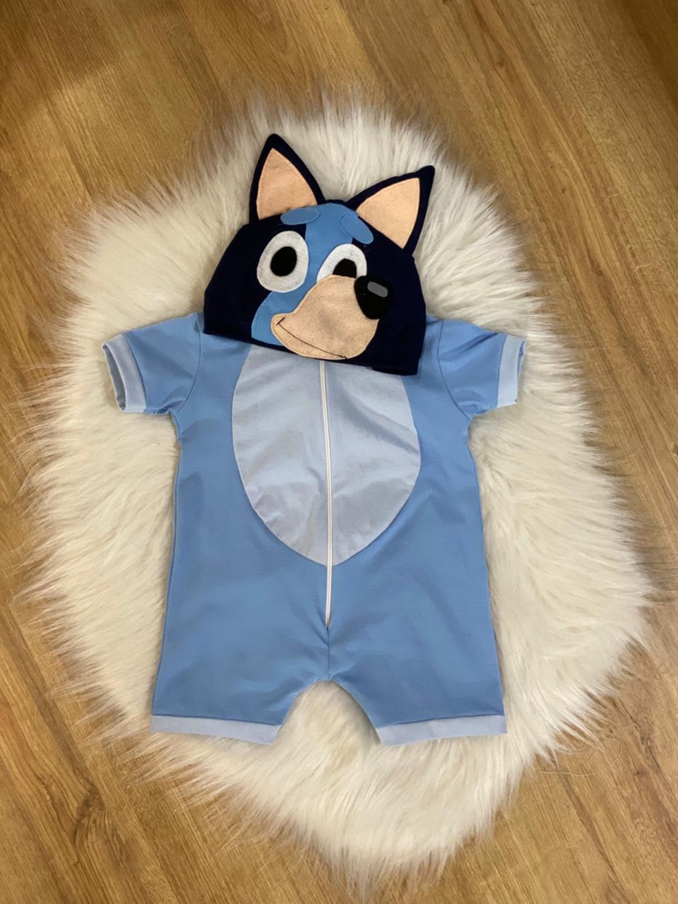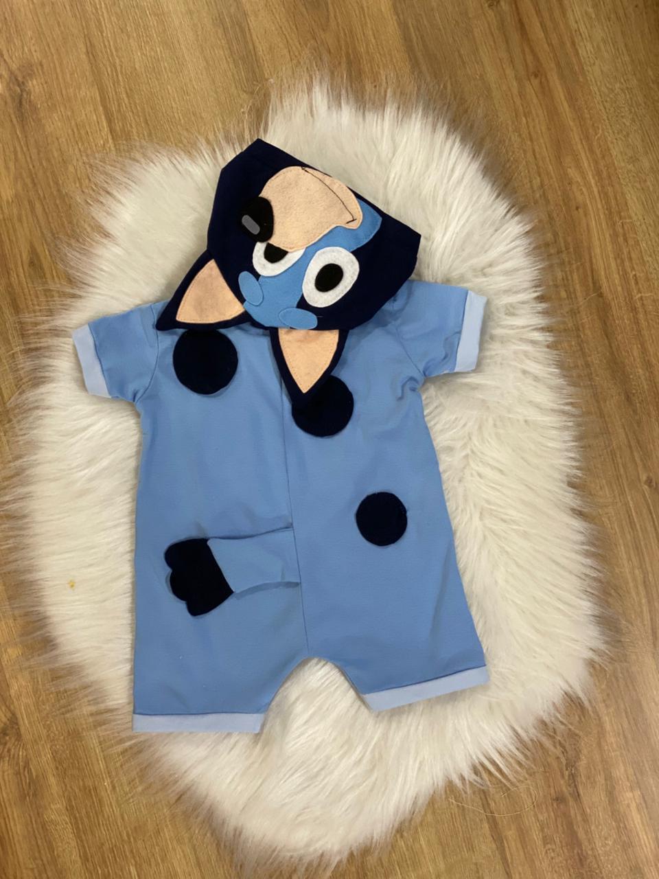 Macacão suuuper fofo simulando a fantasia do cachorrinho australiano Bluey.