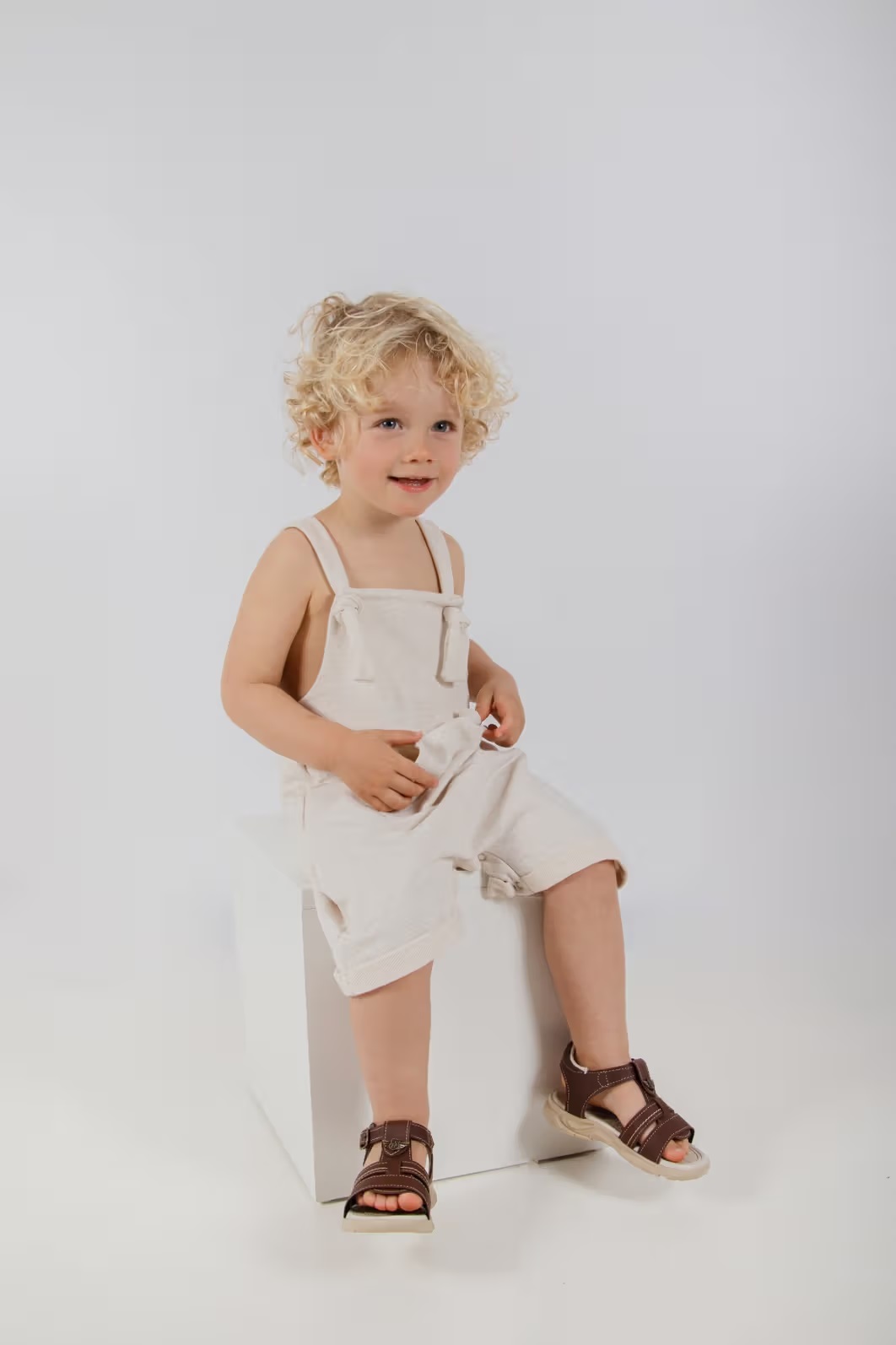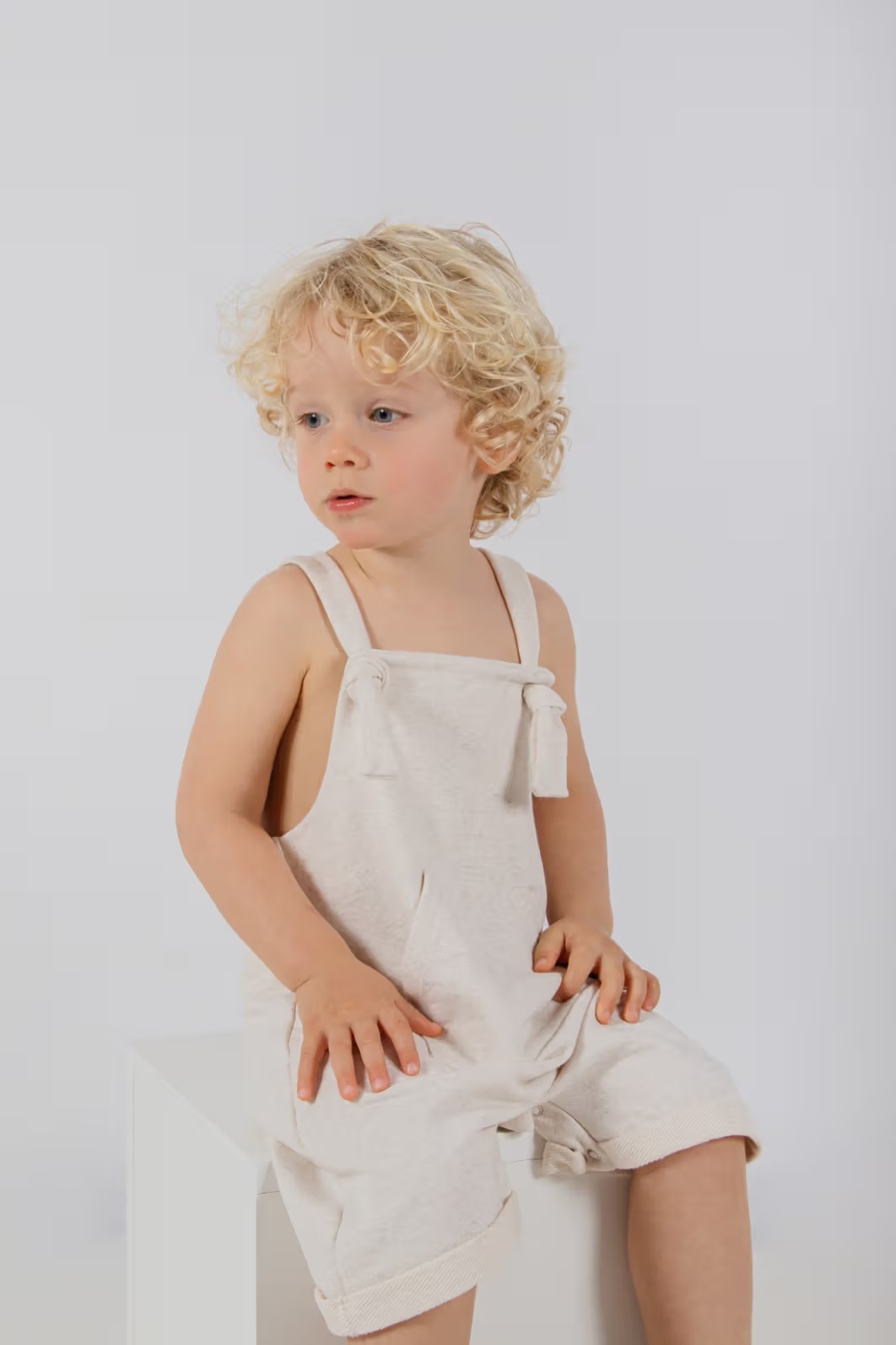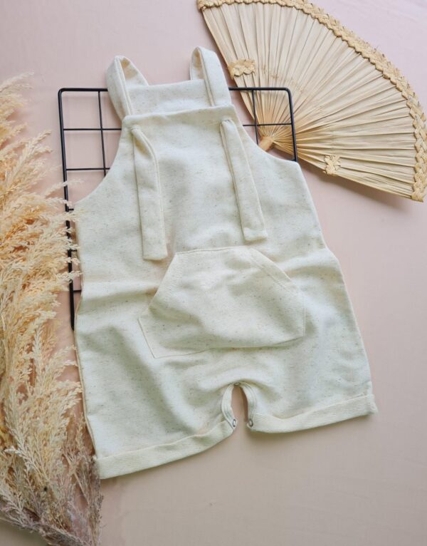 Essa jardineira tem regulagem no ombro pois o fechamento é com um nó e é possível ajustar conforme o tamanho da criança.