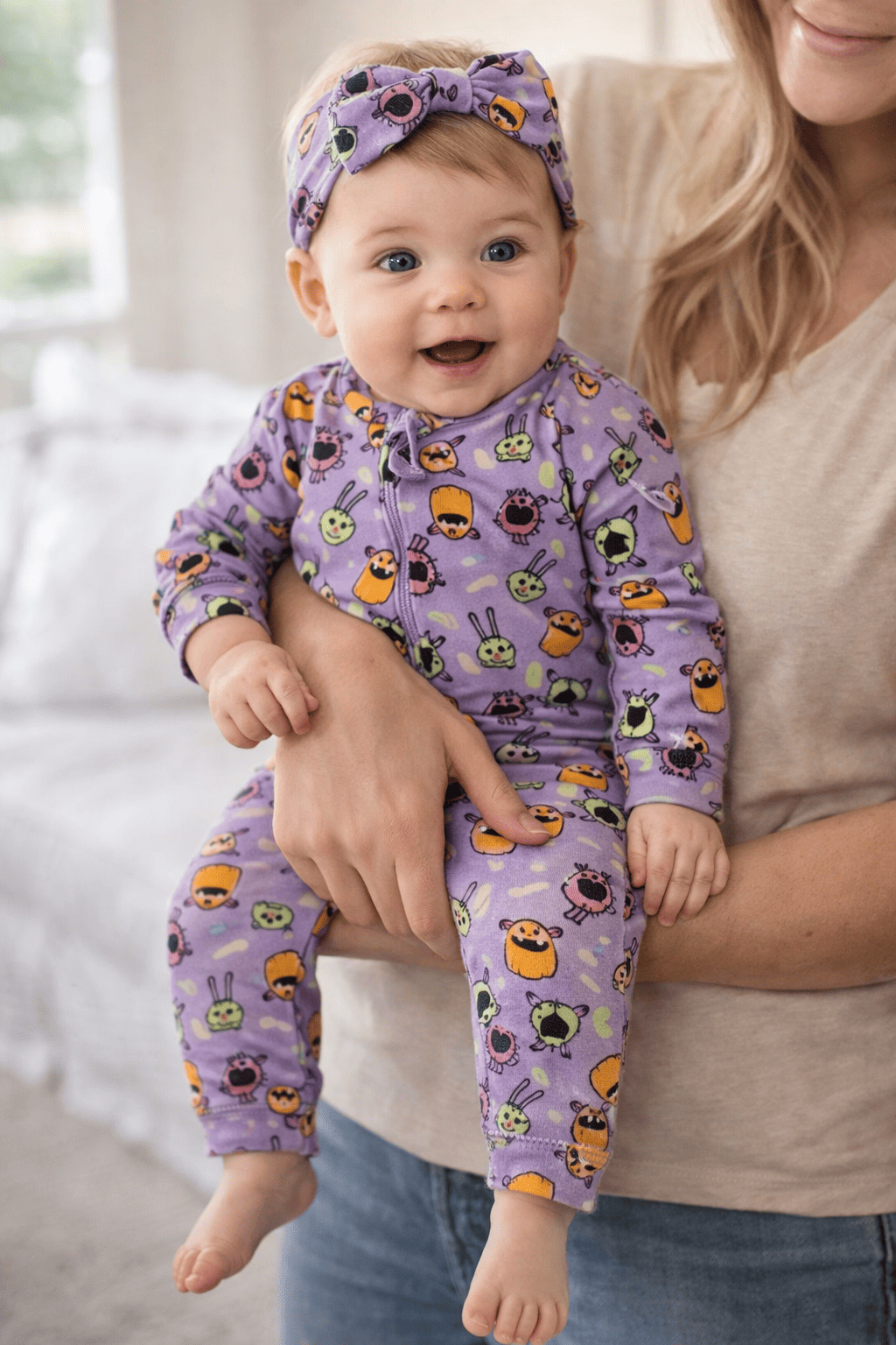 Lindo macacão com fundo lilás e estampa de monstrinhos bem divertido. A peça acompanha um laço na mesma estampa.