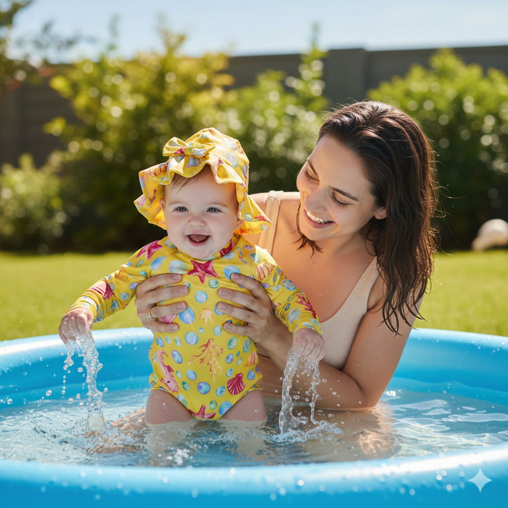 Assim não precisa passar protetor solar nos braços e costas, além de proteger a cabecinha da baby.