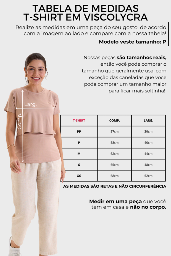 Produzida em viscolycra com recortes feitos especialmente para facilitar na hora de amamentar, disponíveis do P ao GG.